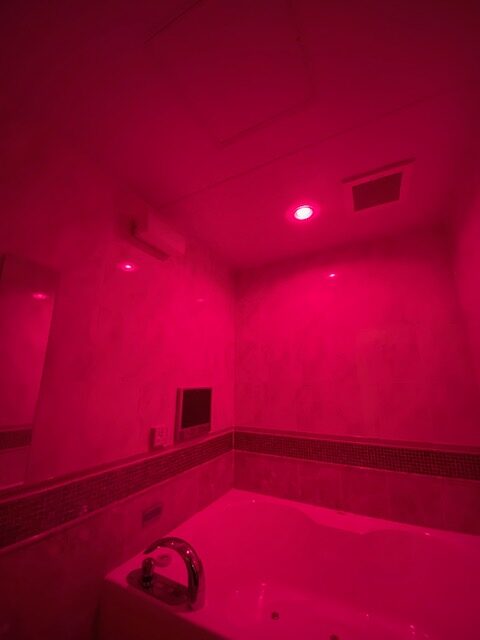 リニューアルした浴室カラー照明はリモコン操作で色を変化させたり、